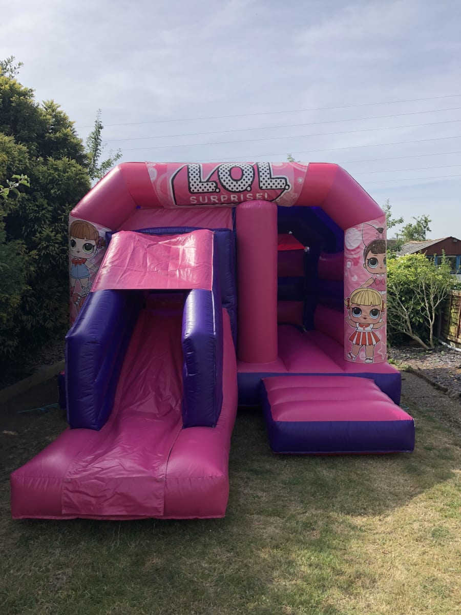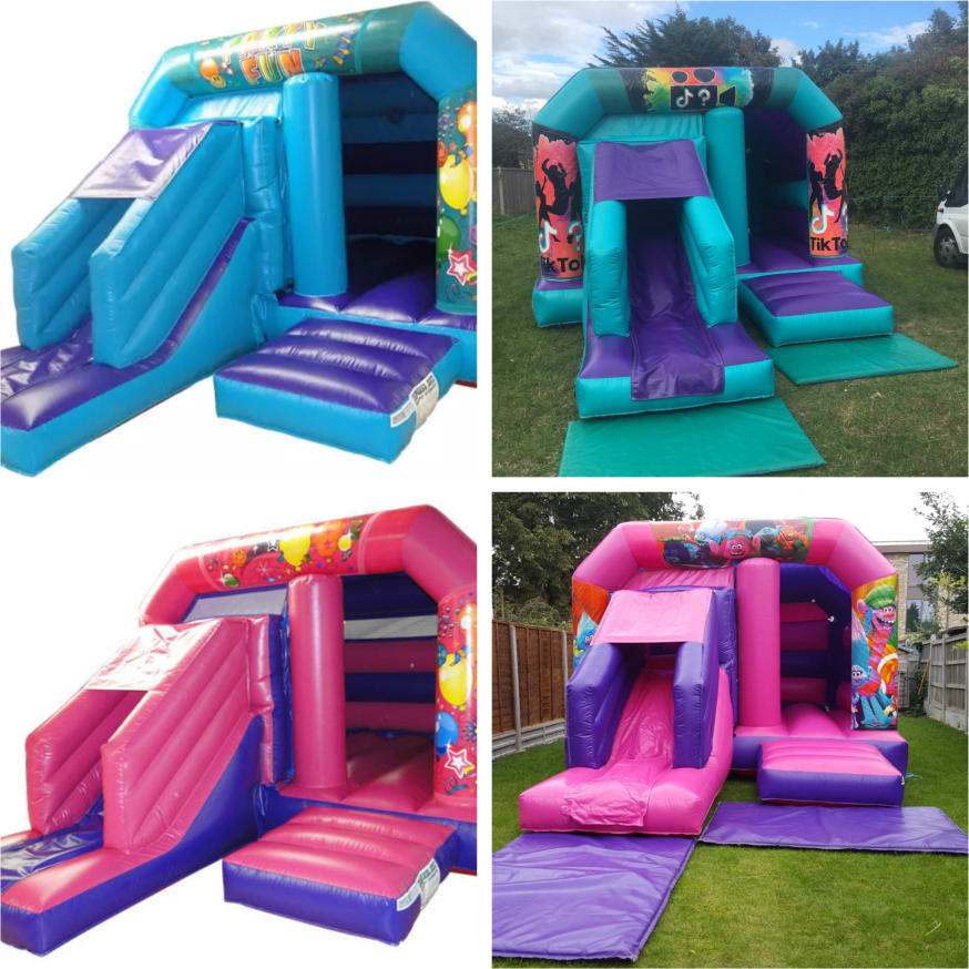 This package should be a simple way of choosing any colour 12ft Wide x 18ft Long inflatable with a Front Slide plus your choice of Theme. Each theme consists of 3 Velcro banners that are quickly attached to the top and front sides after inflating the bouncy castle replacing the printed party theme.