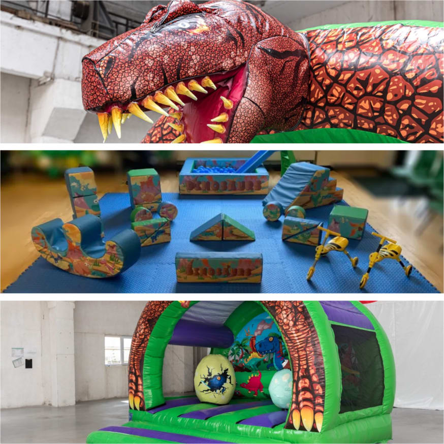 This package includes our brand new 3D Dinosaur castle, its super realistic and will really stand out at your party, the walls of this bouncy castle are netted to give good visibility inside and includes dinosaur eggs to bash into! Of course there is a matching soft play set that includes a ball pit and 2 bug themed ride ons.