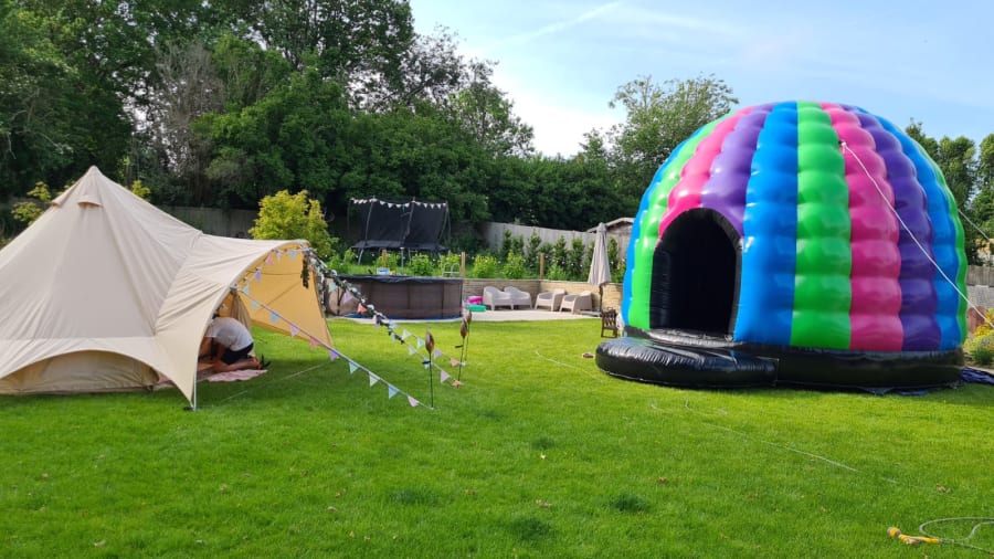 When you book this you also get a 600watt Bluetooth Speaker and two disco lights within the price, and because it’s a proper dome and not a pretend square one, the inside remians dark just like a dance floor except super bouncy!