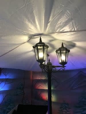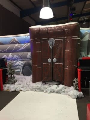 • Full-themed inflatable grotto with wardrobe front and wintery decor.