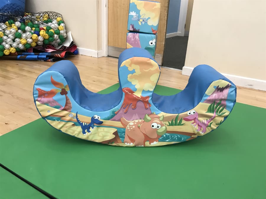 Consists of slide, double rocker, assortment of soft shapes with colourful dinosaur patten all over them.