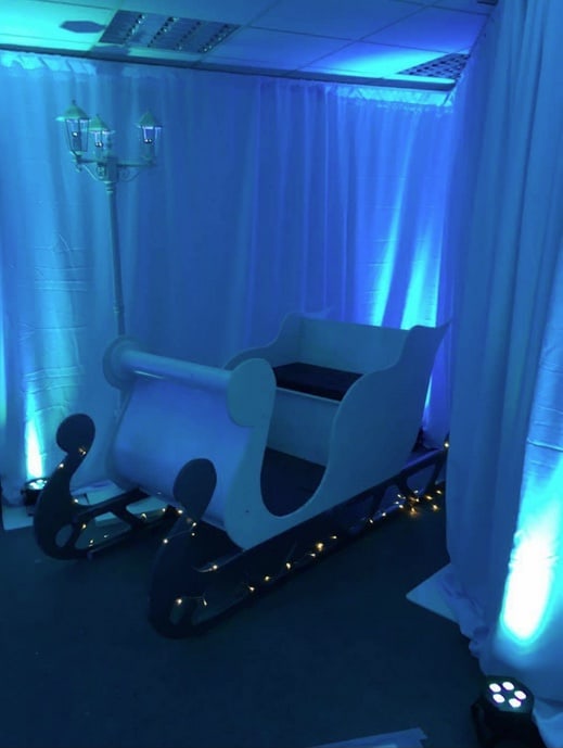 Contact us to book the sleigh photo prop complete with a host of trimmings to make your pictures even more magical. With this option, we will set up your sleigh with a fabulous festive backdrop on snow white flooring, with a pretty white picket fence around it and assorted other props to complete the scene.