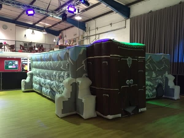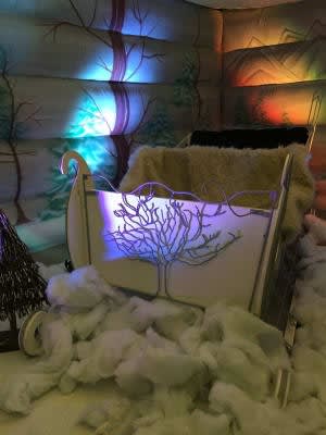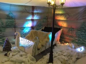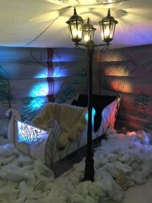- Full-themed inflatable grotto with wardrobe front and wintery decor.