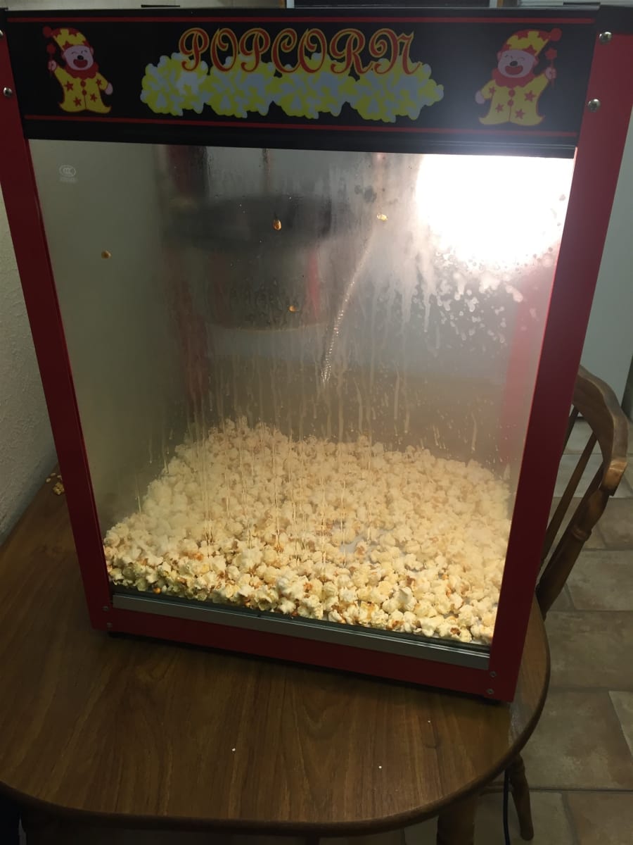 Alternatively, we're happy to provide you with a giant bag full of pre-made pop-corn, that is fresh. This is poured into the machine, and the warming light keeps it warm and fresh inside. Meaning you do not have to cook the pop-corn yourself (although we kinda think it's a cool experience to see it popping).