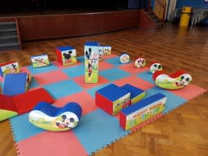 Consists of 16 pieces of shapes, 2 mini rockers, slide and crash mats. Perfect for the under 5 years old.