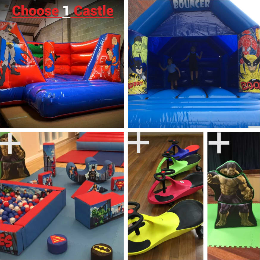 Package includes our NEW Super Hero Castle and Super Hero Soft Play with a choice Inflatables